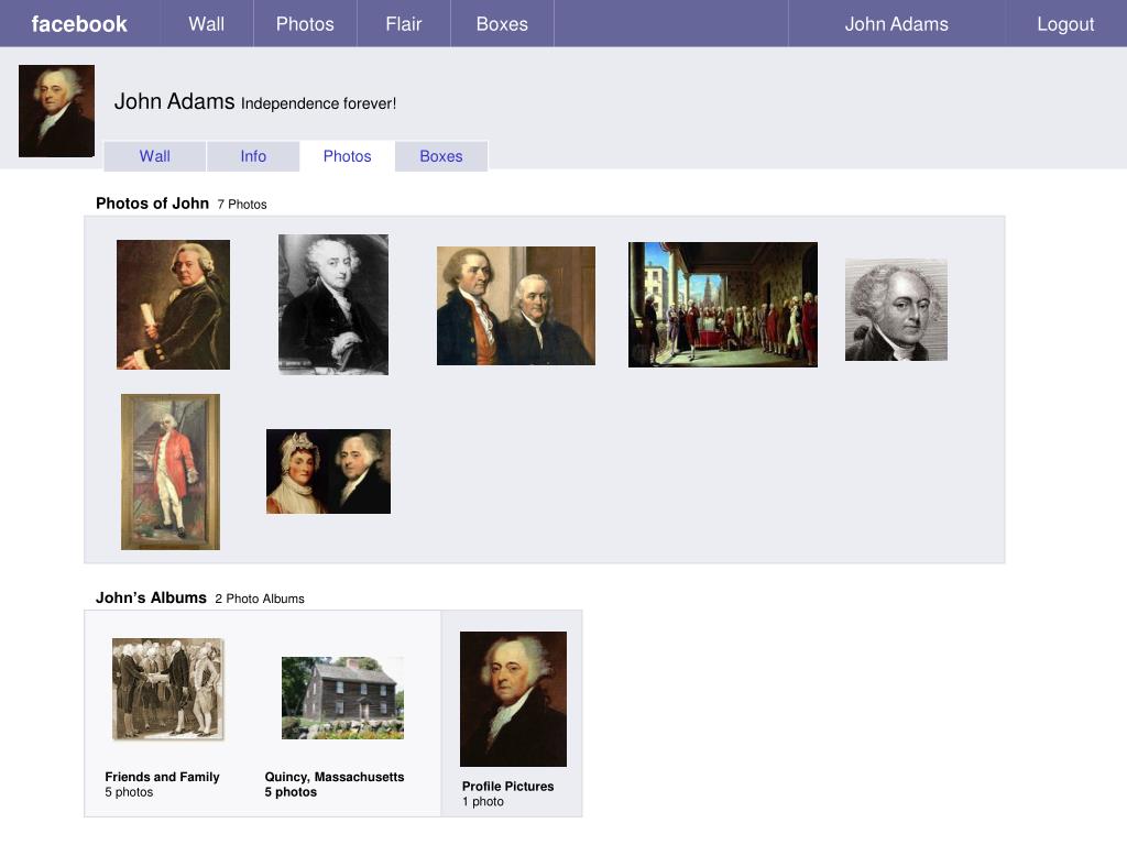 Wall Photos Flair Boxes John Adams Logout John Adams Independence forever! Wall Info Photos Boxes Photos of John7 Photos facebook John’s Albums 2 Photo Albums Friends and Family 5 photos Quincy, Massachusetts 5 photos Profile Pictures 1 photo