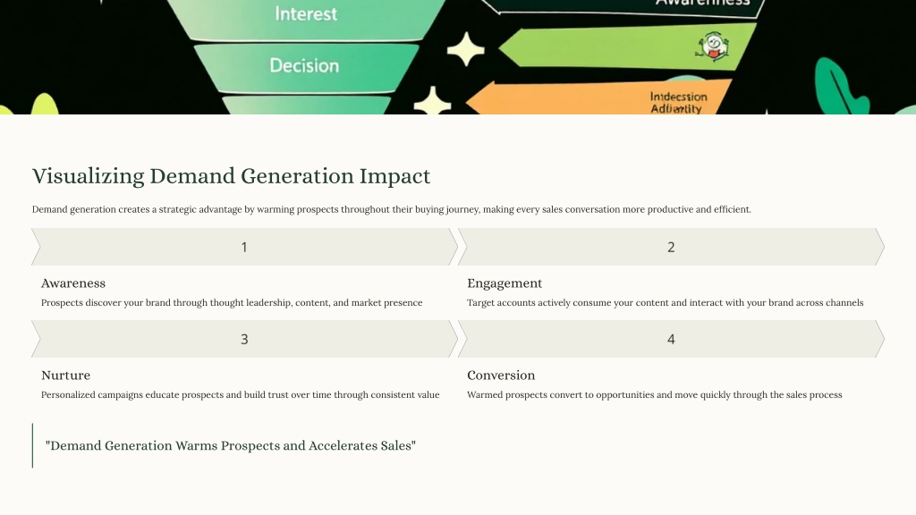 Visualizing Demand Generation Impact Demand generation creates a strategic advantage by warming prospects throughout their buying journey, making every sales conversation more productive and efficient. Awareness Engagement Prospects discover your brand through thought leadership, content, and market presence Target accounts actively consume your content and interact with your brand across channels Nurture Conversion Personalized campaigns educate prospects and build trust over time through consistent value Warmed prospects convert to opportunities and move quickly through the sales process "Demand Generation Warms Prospects and Accelerates Sales"