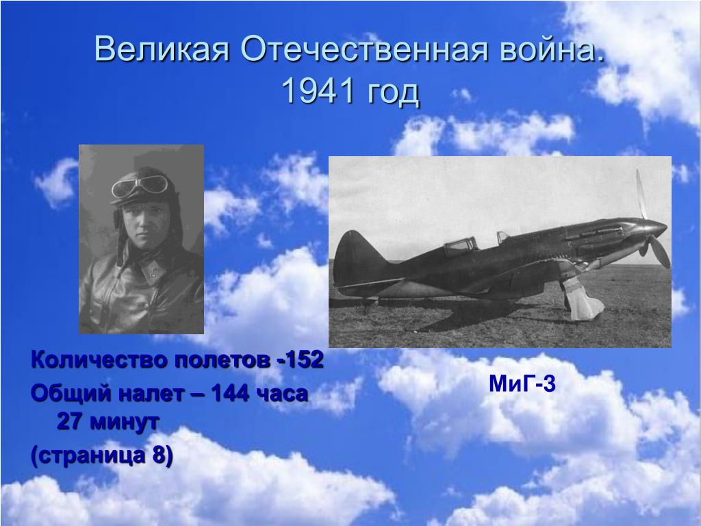 Великая Отечественная война.1941 год МиГ-3 Количество полетов -152 Общий налет – 144 часа 27 минут (страница 8)