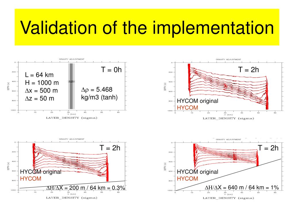 Validation of the implementation T = 0h T = 2h L = 64 km H = 1000 m Dx = 500 m Dz = 50 m Dr = 5.468 kg/m3 (tanh) HYCOM original HYCOM T = 2h T = 2h HYCOM original HYCOM HYCOM original HYCOM DH/DX = 640 m / 64 km = 1% DH/DX = 200 m / 64 km = 0.3%