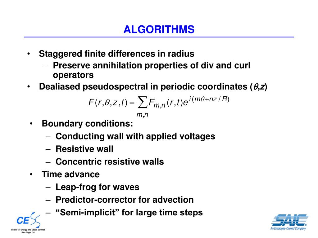 ALGORITHMS • Staggered finite differences in radius • Preserve annihilation properties of div and curl operators • Dealiased pseudospectral in periodic coordinates (,z) • Boundary conditions: • Conducting wall with applied voltages • Resistive wall • Concentric resistive walls • Time advance • Leap-frog for waves • Predictor-corrector for advection • “Semi-implicit” for large time steps