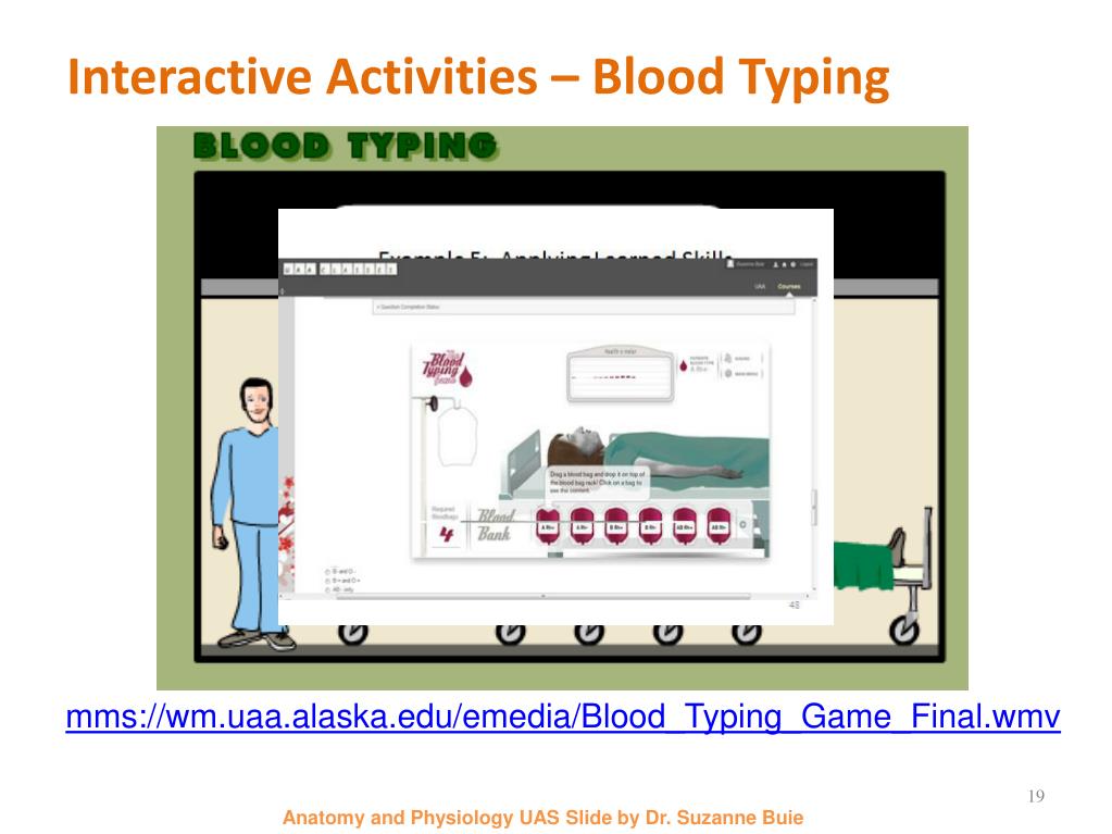 Interactive Activities – Blood Typing mms://wm.uaa.alaska.edu/emedia/Blood_Typing_Game_Final.wmv Anatomy and Physiology UAS Slide by Dr. Suzanne Buie