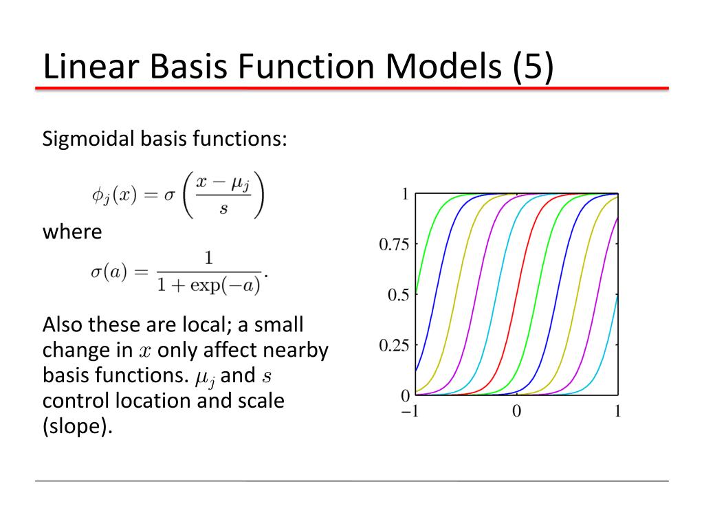 Linear Basis Function Models (5) Sigmoidal basis functions: where Also these are local; a small change in x only affect nearby basis functions. ¹j and s control location and scale (slope).