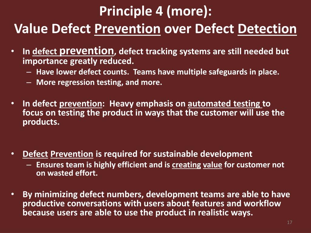 Principle 4 (more): Value Defect Prevention over Defect Detection • In defect prevention, defect tracking systems are still needed but importance greatly reduced. • Have lower defect counts. Teams have multiple safeguards in place. • More regression testing, and more. • In defect prevention: Heavy emphasis on automated testing to focus on testing the product in ways that the customer will use the products. • DefectPrevention is required for sustainable development • Ensures team is highly efficient and is creatingvalue for customer not on wasted effort. • By minimizing defect numbers, development teams are able to have productive conversations with users about features and workflow because users are able to use the product in realistic ways.
