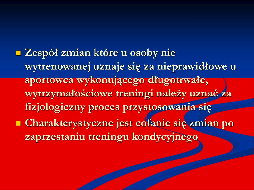Zespół zmian które u osoby nie wytrenowanej uznaje się za nieprawidłowe u sportowca wykonującego długotrwałe, wytrzymałościowe treningi należy uznać za fizjologiczny proces przystosowania się • Charakterystyczne jest cofanie się zmian po zaprzestaniu treningu kondycyjnego