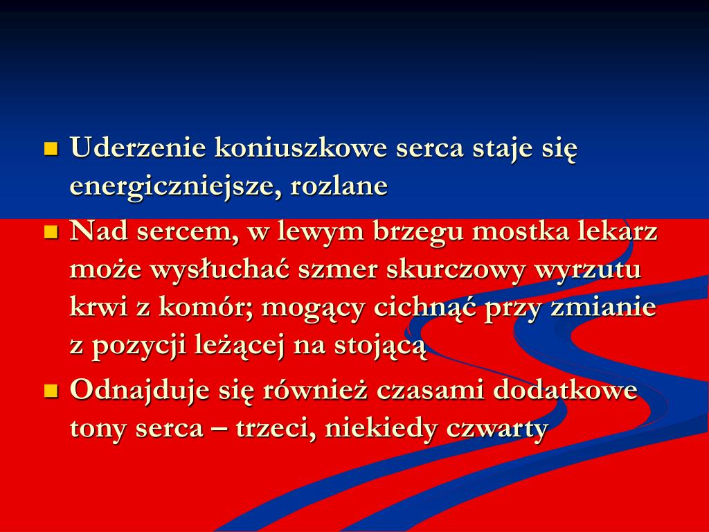 Uderzenie koniuszkowe serca staje się energiczniejsze, rozlane • Nad sercem, w lewym brzegu mostka lekarz może wysłuchać szmer skurczowy wyrzutu krwi z komór; mogący cichnąć przy zmianie z pozycji leżącej na stojącą • Odnajduje się również czasami dodatkowe tony serca – trzeci, niekiedy czwarty