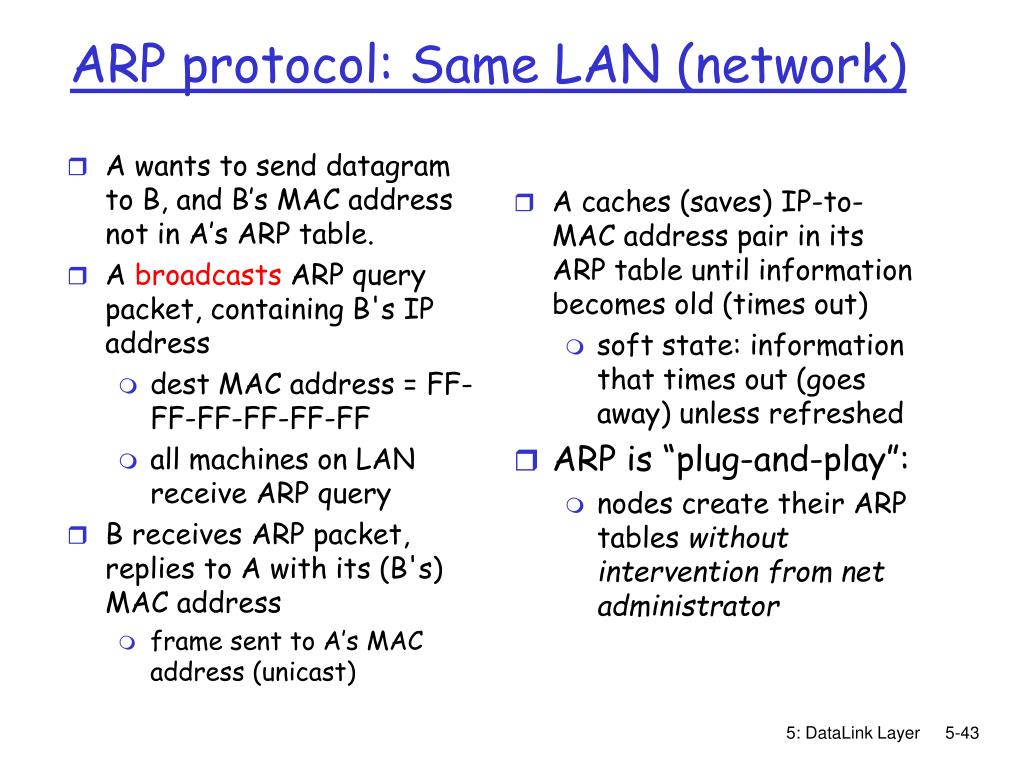 A wants to send datagram to B, and B’s MAC address not in A’s ARP table. A broadcasts ARP query packet, containing B's IP address dest MAC address = FF-FF-FF-FF-FF-FF all machines on LAN receive ARP query B receives ARP packet, replies to A with its (B's) MAC address frame sent to A’s MAC address (unicast) A caches (saves) IP-to-MAC address pair in its ARP table until information becomes old (times out) soft state: information that times out (goes away) unless refreshed ARP is “plug-and-play”: nodes create their ARP tables without intervention from net administrator ARP protocol: Same LAN (network) 5: DataLink Layer
