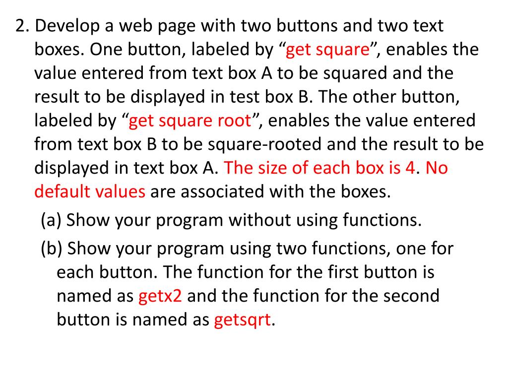 2. Develop a web page with two buttons and two text boxes. One button, labeled by “get square”, enables the value entered from text box A to be squared and the result to be displayed in test box B. The other button, labeled by “get square root”, enables the value entered from text box B to be square-rooted and the result to be displayed in text box A. The size of each box is 4. No default values are associated with the boxes. (a) Show your program without using functions. (b) Show your program using two functions, one for each button. The function for the first button is named as getx2 and the function for the second button is named as getsqrt.