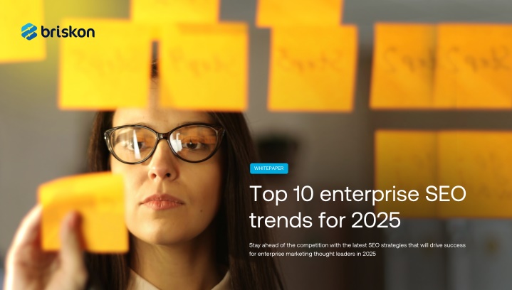 Briskon-WP-051-Top 10 enterprise SEO trends for 2025 With 20+ years of expertise, Briskon helps enterprises secure top positions for even the toughest keywords in search and AI-driven results. Let’s drive measurable growth. Share your requirements today About Briskon Briskon is a full-service digital marketing and so?ware development company commi?ed to helping businesses grow, innovate, and stay ahead of the competition. With deep expertise in SEO, CRO, PPC, social media marketing, web development, mobile app development, auction so?ware, AI & ML, and custom so?ware solutions, Briskon delivers result-centric strategies and cu?ing- edge technology to empower brands. We specialize in providing high-impact solutions for B2B, SaaS, and enterprise businesses worldwide, driving measurable success. info@briskon.com www.briskon.com Disclaimer: This whitepaper is based on comprehensive online research conducted using publicly available information and generative AI. While every e?ort has been made to ensure accuracy, readers are encouraged to independently verify details and consult relevant experts before making any decisions based on this content. Any brands and their hyperlink mentioned in this whitepaper are trademarks of their respective companies. © Copyright 2025, Briskon Technologies Pvt. Ltd. All rights reserved. 14