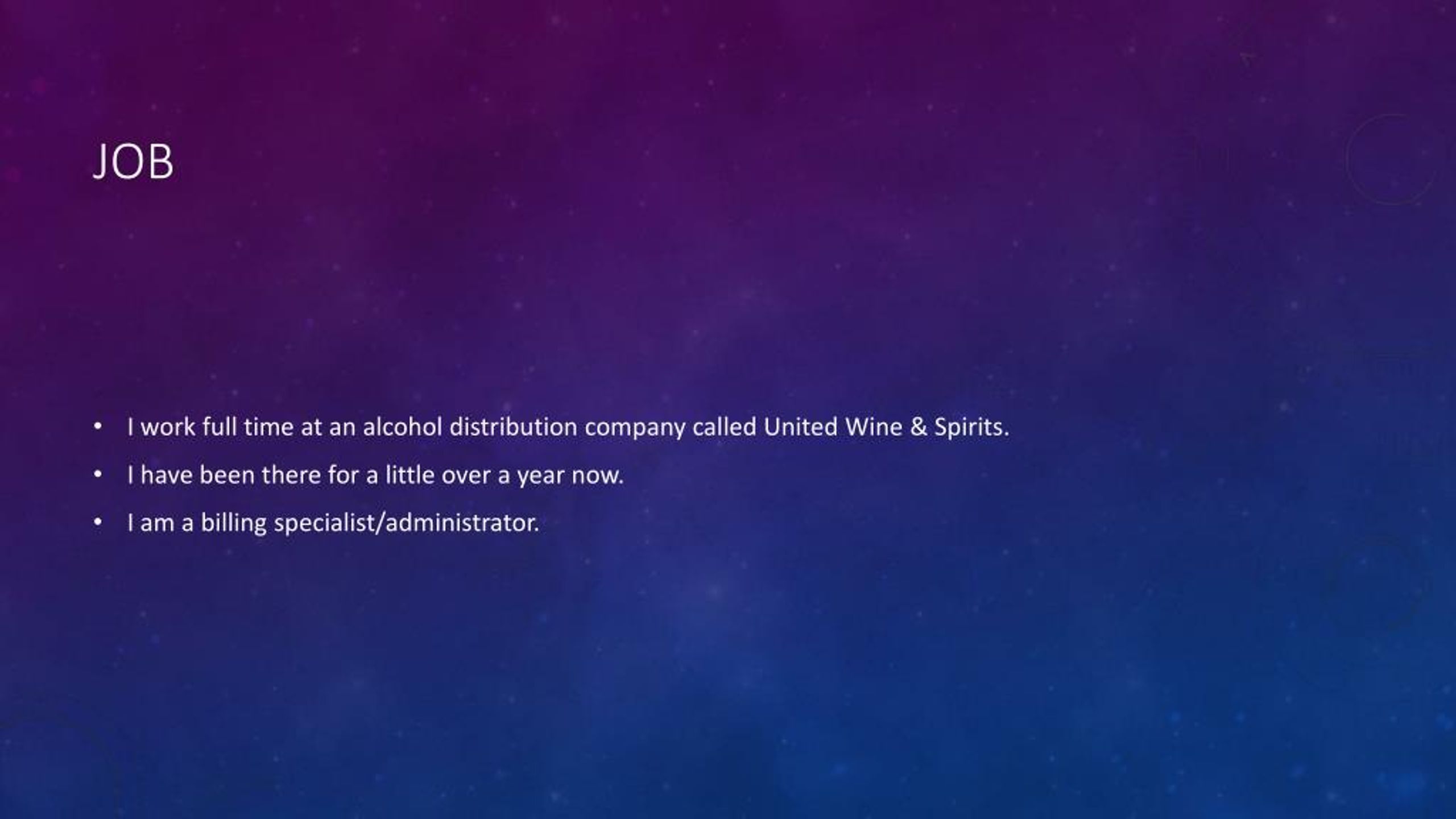 Job • I work full time at an alcohol distribution company called United Wine & Spirits. • I have been there for a little over a year now. • I am a billing specialist/administrator.