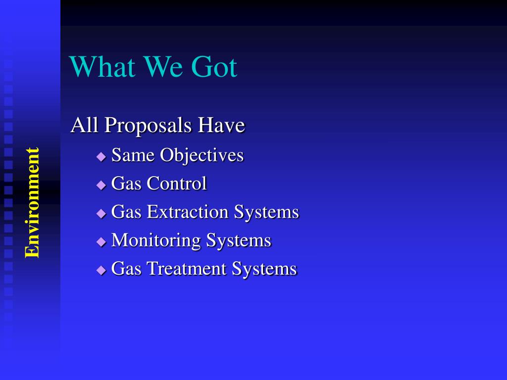 What We Got All Proposals Have • Same Objectives • Gas Control • Gas Extraction Systems • Monitoring Systems • Gas Treatment Systems Environment