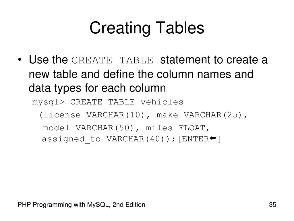Creating Tables • Use the CREATE TABLE statement to create a new table and define the column names and data types for each column mysql> CREATE TABLE vehicles (license VARCHAR(10), make VARCHAR(25), model VARCHAR(50), miles FLOAT, assigned_to VARCHAR(40));[ENTER] PHP Programming with MySQL, 2nd Edition
