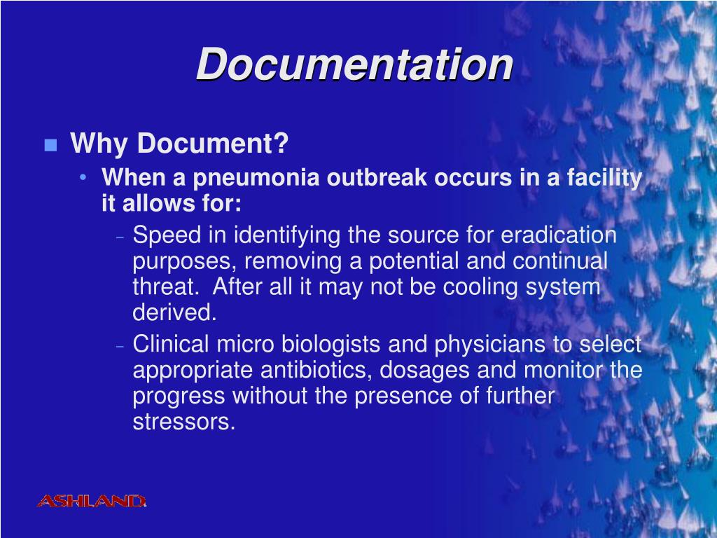 Documentation • Why Document? • When a pneumonia outbreak occurs in a facility it allows for: • Speed in identifying the source for eradication purposes, removing a potential and continual threat. After all it may not be cooling system derived. • Clinical micro biologists and physicians to select appropriate antibiotics, dosages and monitor the progress without the presence of further stressors.
