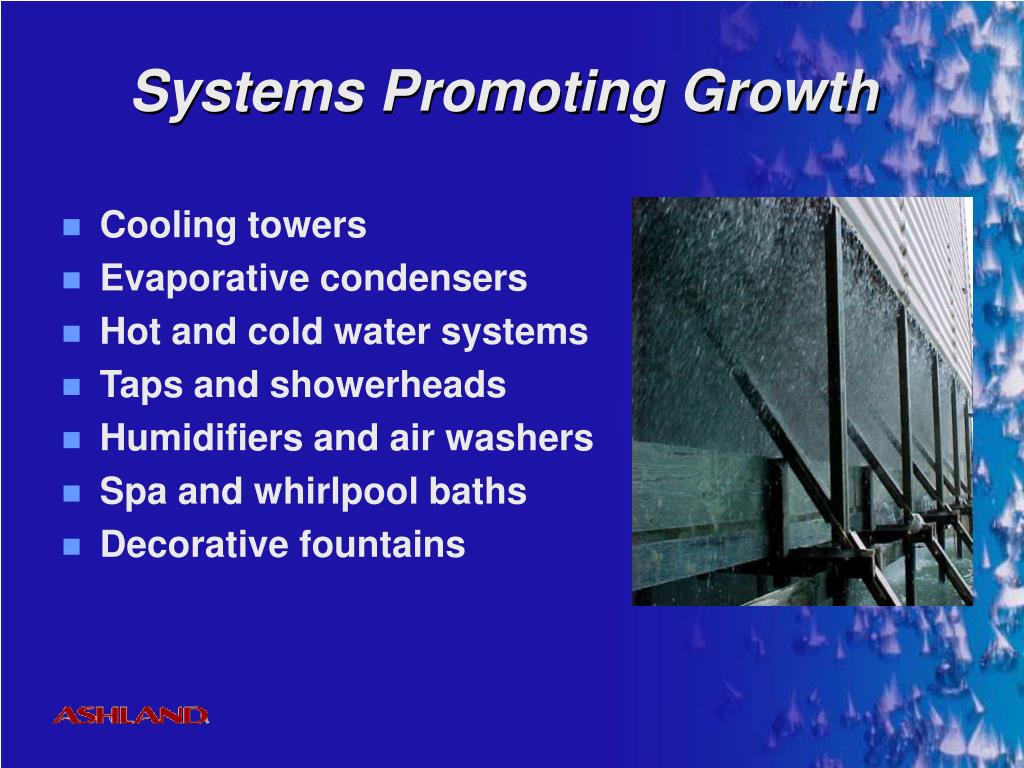 Systems Promoting Growth • Cooling towers • Evaporative condensers • Hot and cold water systems • Taps and showerheads • Humidifiers and air washers • Spa and whirlpool baths • Decorative fountains
