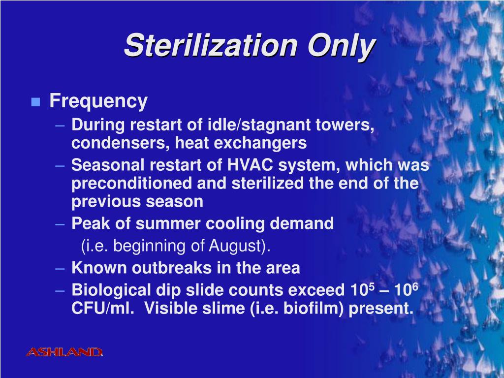 Sterilization Only • Frequency • During restart of idle/stagnant towers, condensers, heat exchangers • Seasonal restart of HVAC system, which was preconditioned and sterilized the end of the previous season • Peak of summer cooling demand (i.e. beginning of August). • Known outbreaks in the area • Biological dip slide counts exceed 105 – 106 CFU/ml. Visible slime (i.e. biofilm) present.