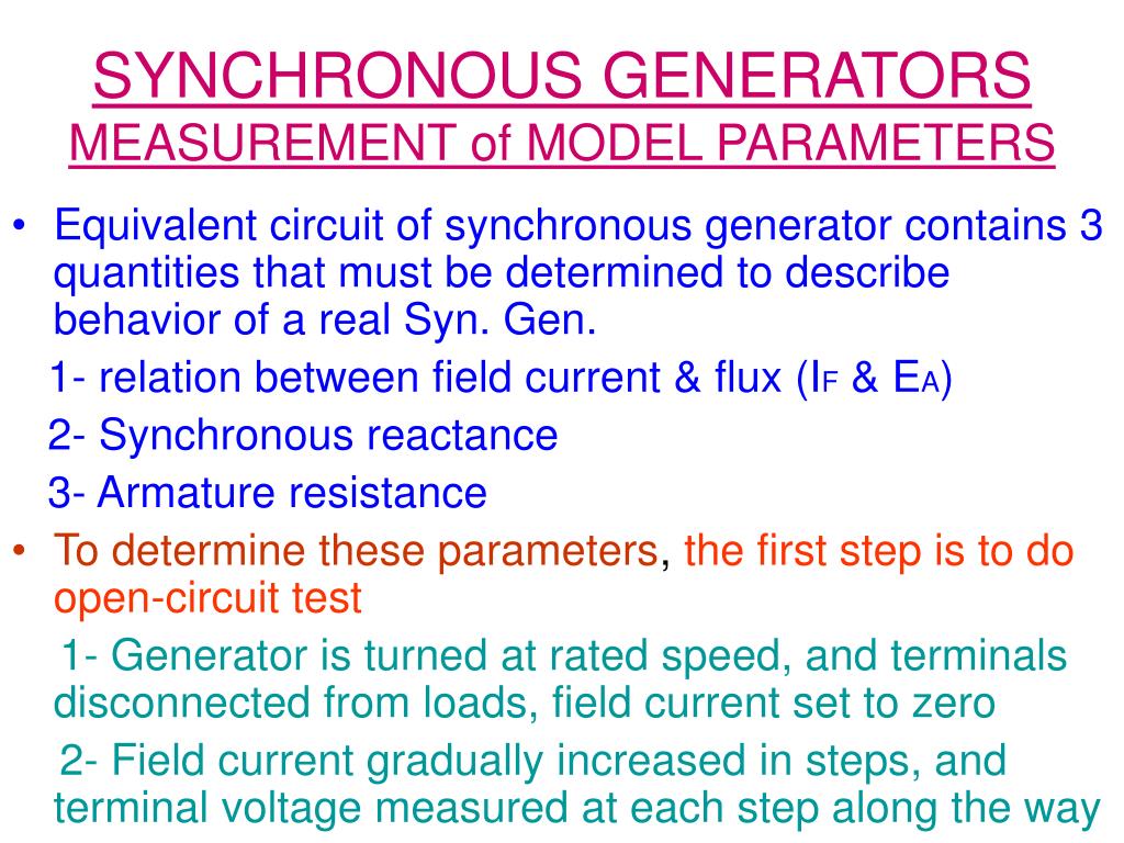 SYNCHRONOUS GENERATORSMEASUREMENT of MODEL PARAMETERS • Equivalent circuit of synchronous generator contains 3 quantities that must be determined to describe behavior of a real Syn. Gen. 1- relation between field current & flux (IF & EA) 2- Synchronous reactance 3- Armature resistance • To determine these parameters, the first step is to do open-circuit test 1- Generator is turned at rated speed, and terminals disconnected from loads, field current set to zero 2- Field current gradually increased in steps, and terminal voltage measured at each step along the way