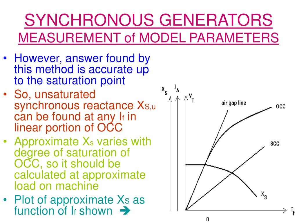 SYNCHRONOUS GENERATORSMEASUREMENT of MODEL PARAMETERS • However, answer found by this method is accurate up to the saturation point • So, unsaturated synchronous reactance XS,u can be found at any If in linear portion of OCC • Approximate Xs varies with degree of saturation of OCC, so it should be calculated at approximate load on machine • Plot of approximate XS as function of If shown