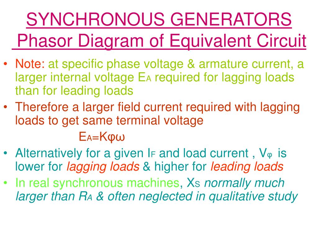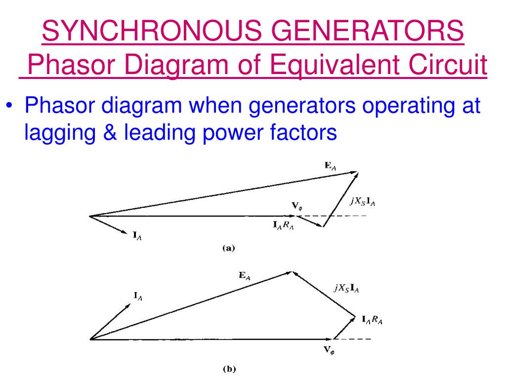 SYNCHRONOUS GENERATORS Phasor Diagram of Equivalent Circuit • Phasor diagram when generators operating at lagging & leading power factors