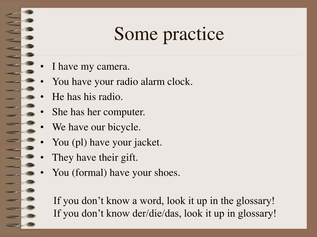 Some practice • I have my camera. • You have your radio alarm clock. • He has his radio. • She has her computer. • We have our bicycle. • You (pl) have your jacket. • They have their gift. • You (formal) have your shoes. If you don’t know a word, look it up in the glossary! If you don’t know der/die/das, look it up in glossary!