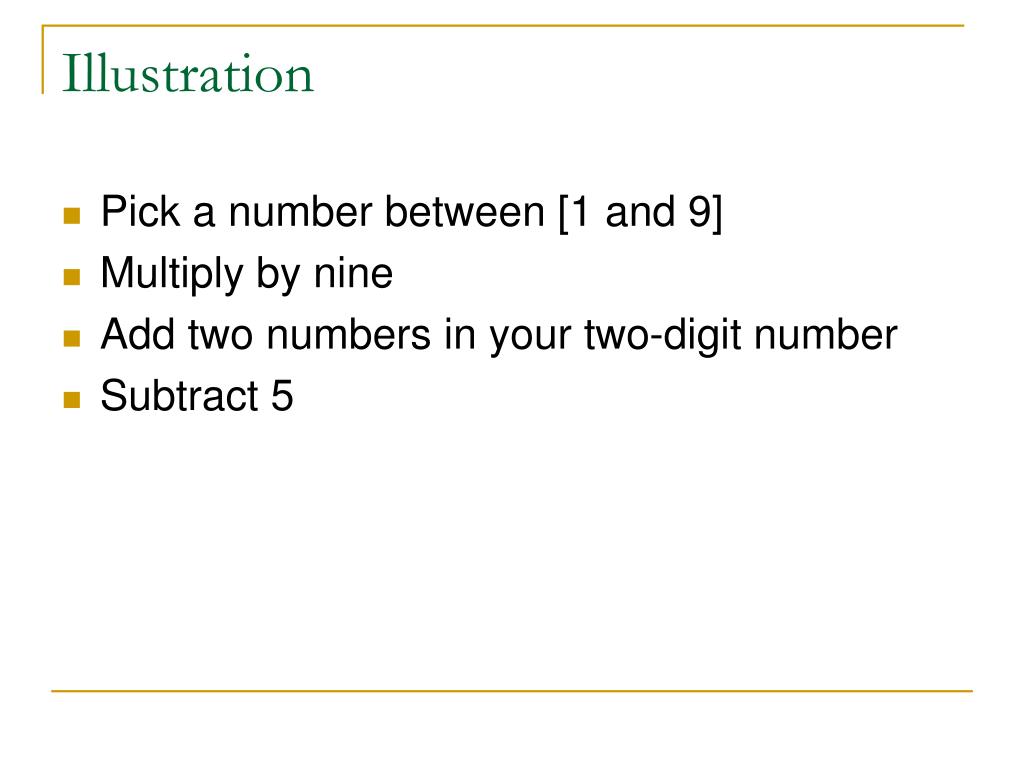 Illustration • Pick a number between [1 and 9] • Multiply by nine • Add two numbers in your two-digit number • Subtract 5