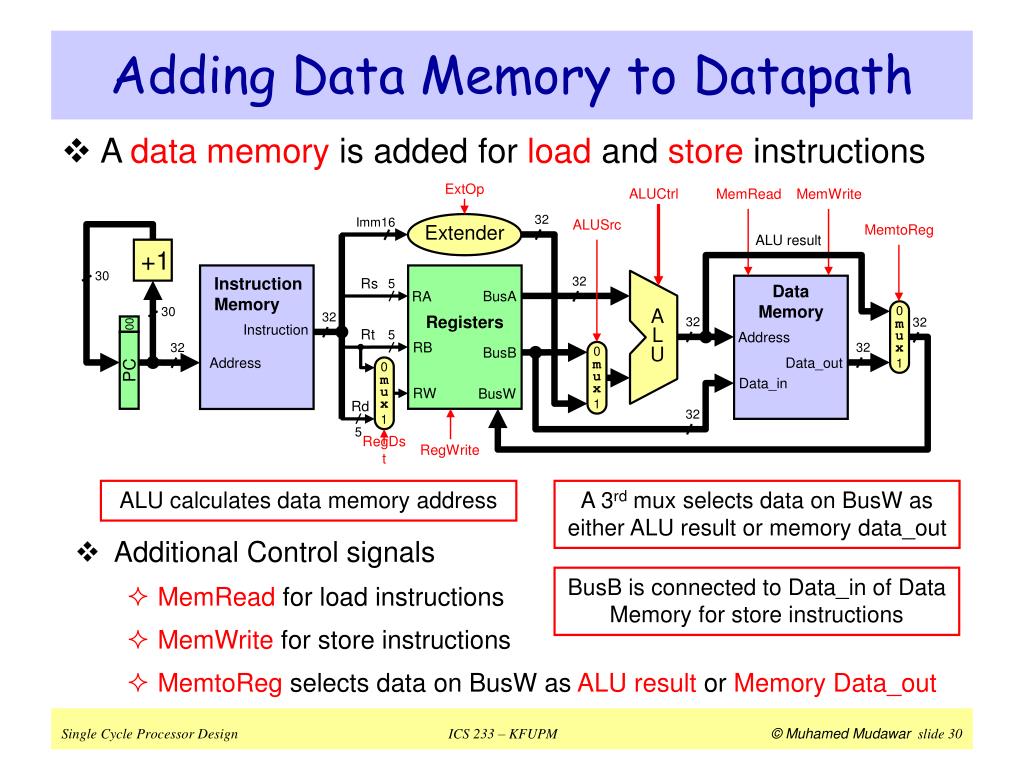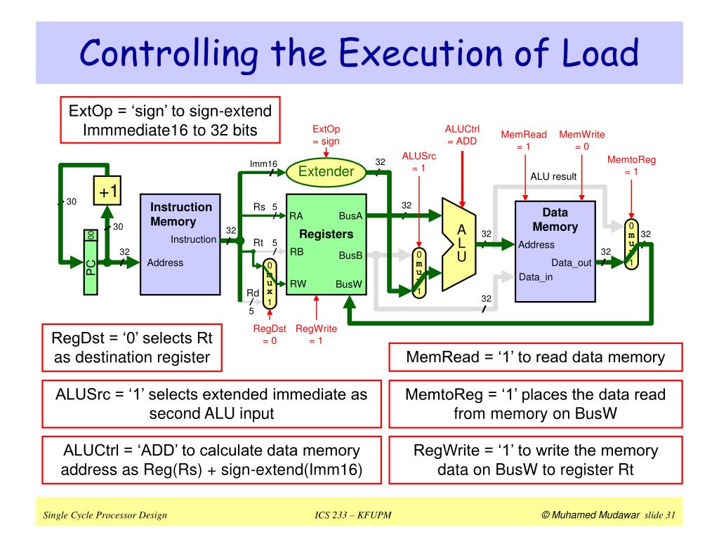 RegWrite = 1 +1 ALUCtrl 30 Instruction Memory Registers 32 Rs 5 A L U 30 BusA RA 32 32 Instruction Rt 32 5 RB 32 BusB Address m u x m u x m u x m u x 0 0 0 0 RW BusW Rd ExtOp 32 ALUSrc = 0 5 1 1 1 1 RegDst = 1 ALU result Extender Imm16 RegWrite = 1 +1 ALUCtrl 30 Instruction Memory Registers 32 Rs 5 A L U 30 BusA RA 32 32 Instruction Rt 32 5 RB 32 00 00 BusB Address RW BusW PC PC Rd ExtOp 32 ALUSrc = 1 5 RegDst = 0 ALU result Extender Imm16 Controlling ALU Instructions For R-type ALU instructions, RegDst is ‘1’ to select Rd on RW and ALUSrc is ‘0’ to select BusB as second ALU input. The active part of datapath is shown in green For I-type ALU instructions, RegDst is ‘0’ to select Rt on RW and ALUSrc is ‘1’ to select Extended immediate as second ALU input. The active part of datapath is shown in green