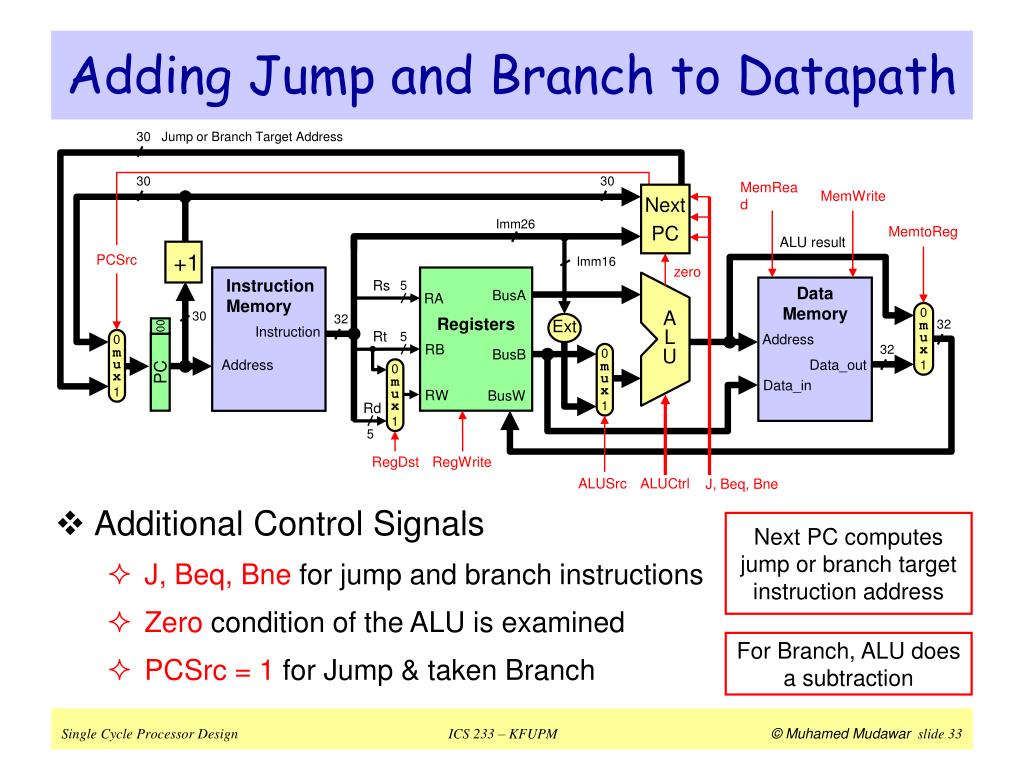 30 30 30 PCSrc zero m u x m u x m u x m u x 0 0 0 0 30 MemRead MemWrite 1 1 1 1 Ext 32 32 J, Beq, Bne 00 PC Adding Jump and Branch to Datapath Jump or Branch Target Address • Additional Control Signals • J, Beq, Bne for jump and branch instructions • Zero condition of the ALU is examined • PCSrc = 1 for Jump & taken Branch Next PC Imm26 MemtoReg ALU result +1 Imm16 Instruction Memory Registers Rs 5 Data Memory BusA RA A L U 32 Instruction Rt 5 Address RB BusB Data_out Address Data_in RW BusW Rd 5 RegDst RegWrite ALUSrc ALUCtrl Next PC computes jump or branch target instruction address For Branch, ALU does a subtraction