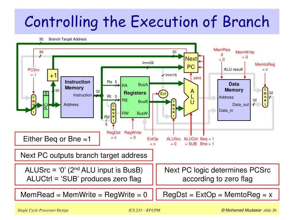 30 30 30 MemtoReg = x PCSrc = 1 zero Registers BusA RA m u x m u x m u x m u x 0 0 0 0 A L U 30 MemRead = 0 MemWrite = 0 RB 1 1 1 1 BusB RW BusW Ext 32 32 RegDst = x RegWrite = 0 Beq = 1 Bne = 1 ExtOp = x ALUSrc = 0 ALUCtrl = SUB 00 PC Controlling the Execution of Branch Branch Target Address Next PC Imm26 ALU result +1 Imm16 Instruction Memory Rs 5 Data Memory 32 Instruction Rt 5 Address Data_out Address Data_in Rd 5 Either Beq or Bne =1 Next PC outputs branch target address ALUSrc = ‘0’ (2nd ALU input is BusB) ALUCtrl = ‘SUB’ produces zero flag Next PC logic determines PCSrc according to zero flag MemRead = MemWrite = RegWrite = 0 RegDst = ExtOp = MemtoReg = x