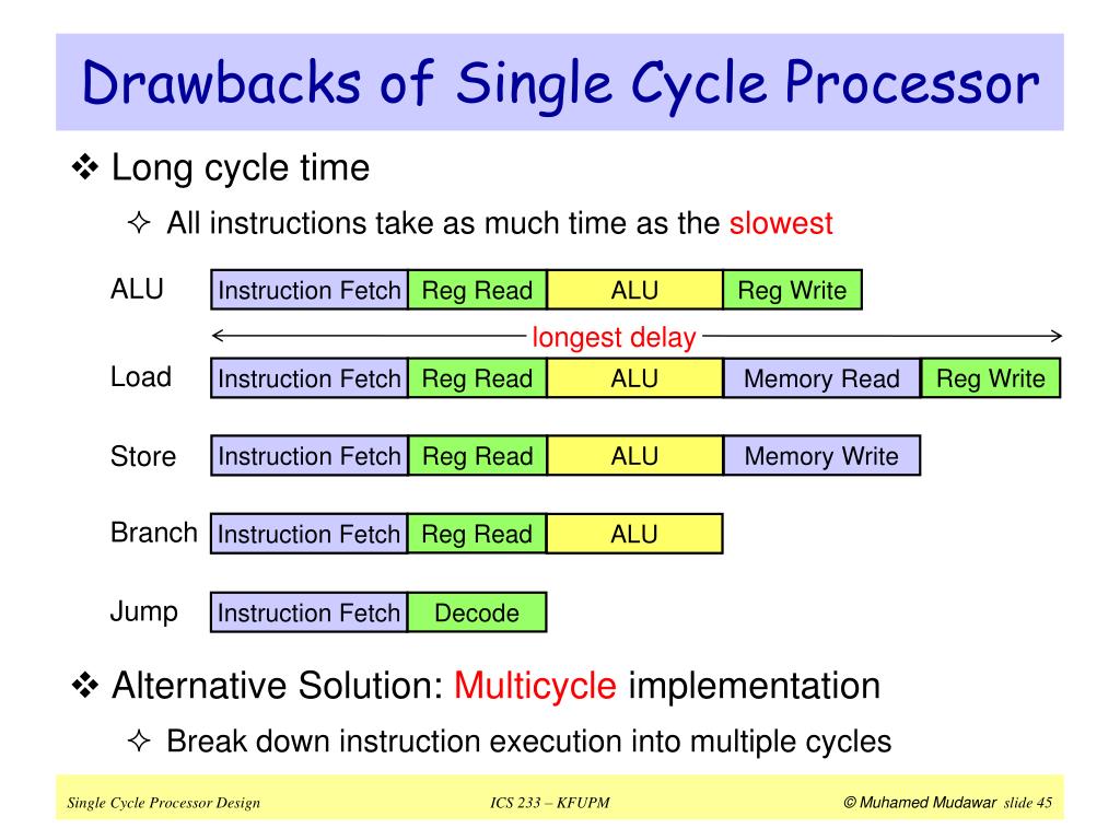 Worst Case Timing – Cont'd • Long cycle time: must be long enough for Load operation PC’s Clk-to-Q + Instruction Memory’s Access Time + Maximum of ( Register File’s Access Time, Delay through control logic + extender + ALU mux) + ALU to Perform a 32-bit Add + Data Memory Access Time + Delay through MemtoReg Mux + Setup Time for Register File Write + Clock Skew • Cycle time is longer than needed for other instructions • Therefore, single cycle processor design is not used in practice