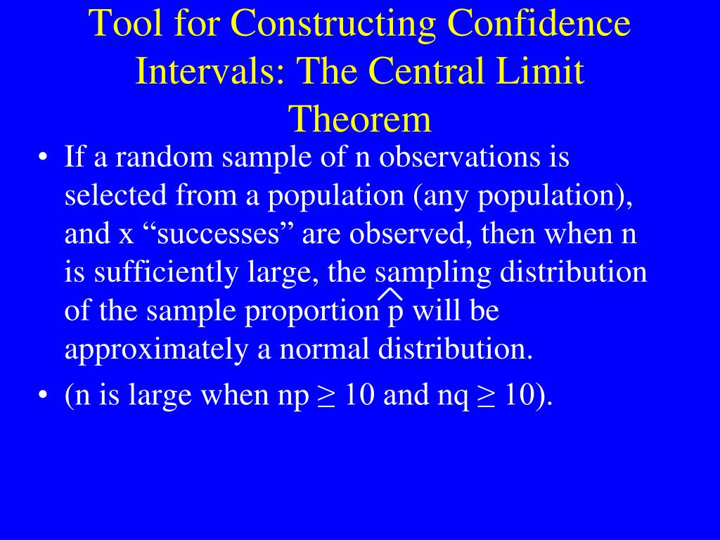 Tool for Constructing Confidence Intervals: The Central Limit Theorem • If a random sample of n observations is selected from a population (any population), and x “successes” are observed, then when n is sufficiently large, the sampling distribution of the sample proportion p will be approximately a normal distribution. • (n is large when np ≥ 10 and nq ≥ 10).