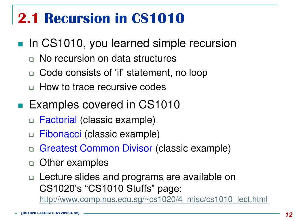 2.1 Recursion in CS1010: GCD (2/2) • Recurrence relation: // Precond: a, b non-negative, // not both zeroes intgcd(int a, int b) { if (b == 0) return a; else return gcd(b, a % b); } a, if b = 0 gcd(b, a%b), if b > 0 gcd(a, b) = [CS1020 Lecture 8 AY2013/4 S2]