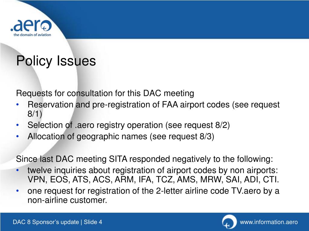 Policy Issues Requests for consultation for this DAC meeting • Reservation and pre-registration of FAA airport codes (see request 8/1) • Selection of .aero registry operation (see request 8/2) • Allocation of geographic names (see request 8/3) Since last DAC meeting SITA responded negatively to the following: • twelve inquiries about registration of airport codes by non airports: VPN, EOS, ATS, ACS, ARM, IFA, TCZ, AMS, MRW, SAI, ADI, CTI. • one request for registration of the 2-letter airline code TV.aero by a non-airline customer.