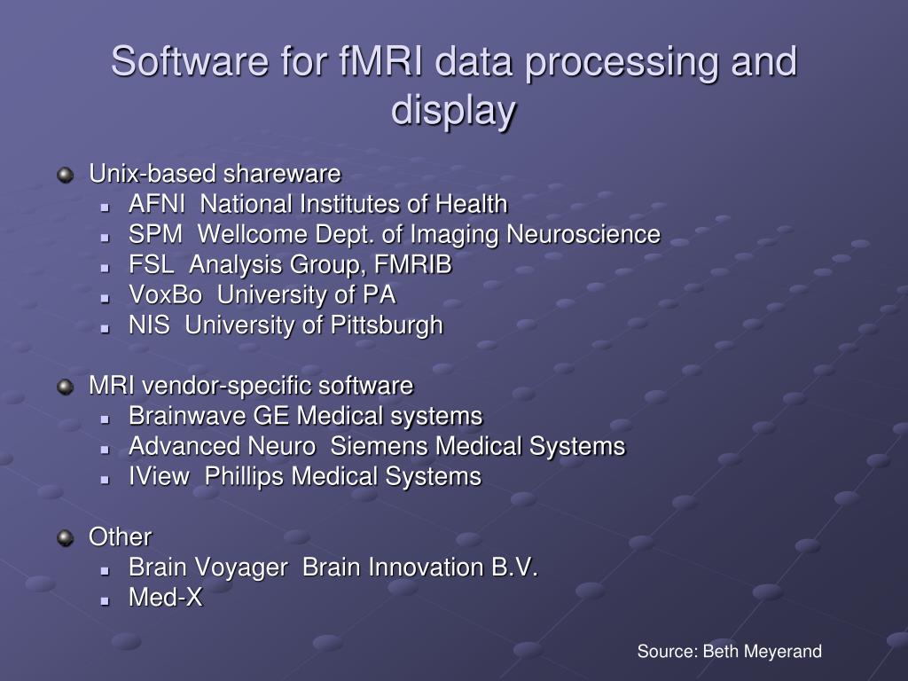 Software for fMRI data processing and display • Unix-based shareware • AFNI National Institutes of Health • SPM Wellcome Dept. of Imaging Neuroscience • FSL Analysis Group, FMRIB • VoxBo University of PA • NIS University of Pittsburgh • MRI vendor-specific software • Brainwave GE Medical systems • Advanced Neuro Siemens Medical Systems • IView Phillips Medical Systems • Other • Brain Voyager Brain Innovation B.V. • Med-X Source: Beth Meyerand