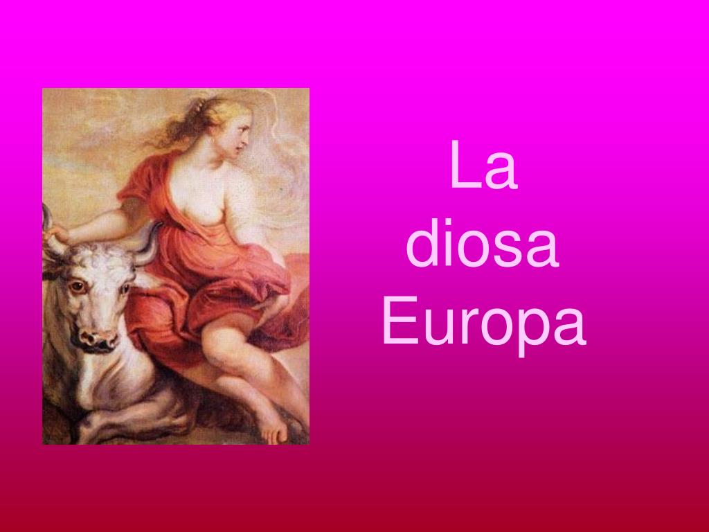 La Diosa Europa Hija de los reyes de Sidón y Tiro, Agenor y Telefasa. Zeus enamorado de la muchacha, se presentó ante ella transformado en un hermoso toro blanco mientras Europa jugaba en la playa. Cuando la muchacha se acerca a acariciarlo y lo monta el animal emprende una veloz huida a través del mar hasta llegar a Creta. Europa dio a Zeus tres hijos: Minos, Sarpedón, Radamantis. Después el dios la casó con el rey Aterión de Creta. Como regalo de bodas le entregó a Talos el autómata, un perro que no dejaba escapar ninguna pieza y una jabalina de caza que nunca erraba el blanco. A la muerte de Aterión Minos le sucedió en el trono cretense.