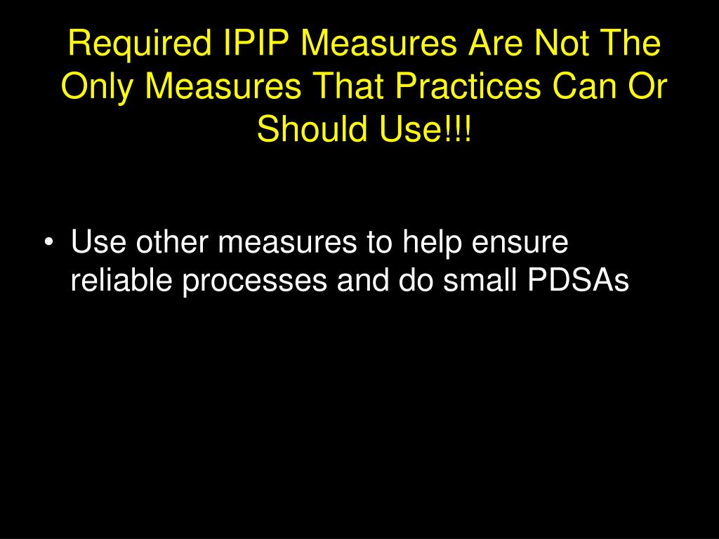 Required IPIP Measures Are Not The Only Measures That Practices Can Or Should Use!!! • Use other measures to help ensure reliable processes and do small PDSAs