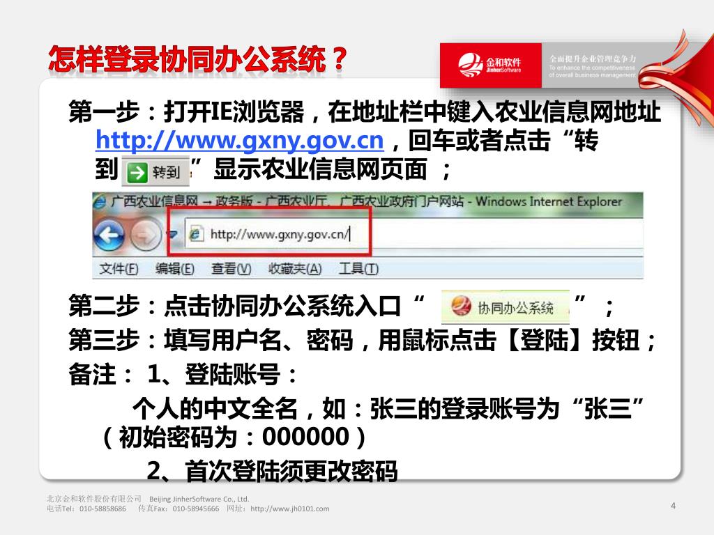 www.jh0101.com. 农业厅 OA 协同办公平台应用指导. 广西南宁金和软件有限公司. 北京金和软件股份有限公司 地址:北京市海淀区上地东路 1 号盈创动力大厦 A 座 4 层 Add: 4F, Creative Power A, No.1 Shangdi East Road, Haidian District, Beijing 100085 电话 Tel : 010-58858686 传真 Fax : 010-58945666 网址: http://www.jh0101.com. 应用指导大纲. 系统登录 客户端 IE 设置 主页门户