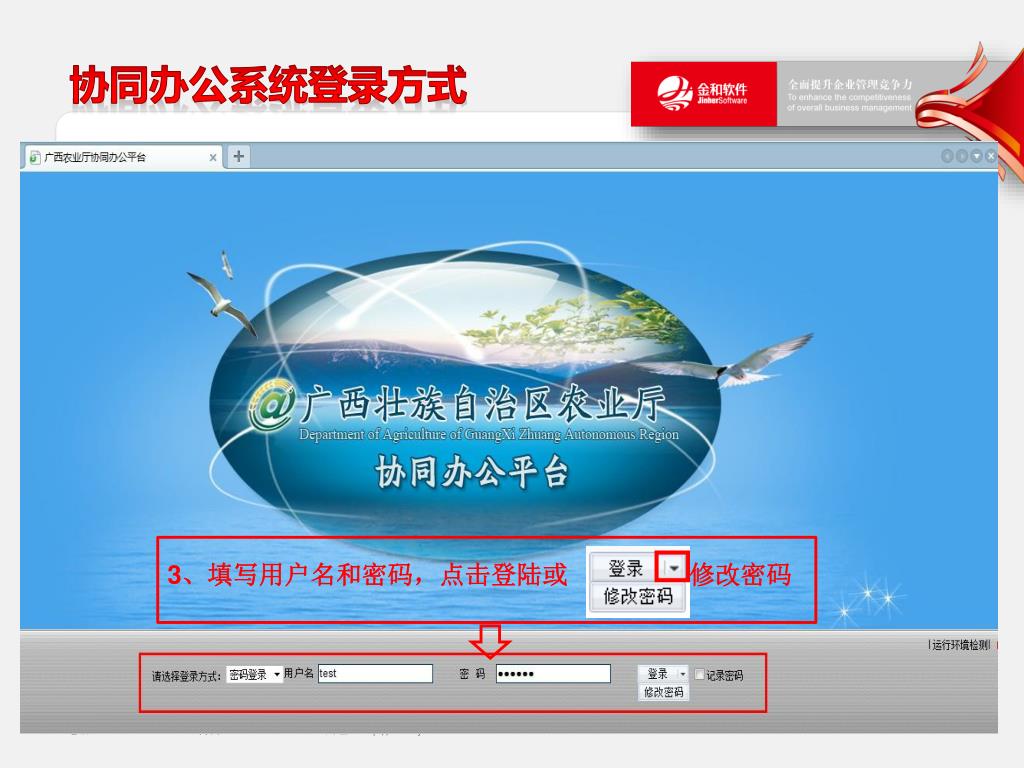 怎样登录协同办公系统? 第一步:打开IE浏览器,在地址栏中键入农业信息网地址http://www.gxny.gov.cn,回车或者点击“转到”显示农业信息网页面 ; 第二步:点击协同办公系统入口“ ”; 第三步:填写用户名、密码,用鼠标点击【登陆】按钮; 备注: 1、登陆账号: 个人的中文全名,如:张三的登录账号为“张三” (初始密码为:000000) 2、首次登陆须更改密码