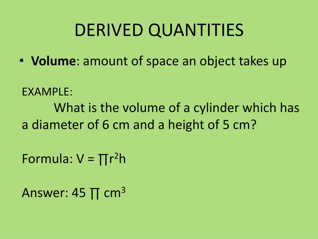 DERIVED QUANTITIES • Volume: amount of space an object takes up EXAMPLE: What is the volume of a cylinder which has a diameter of 6 cm and a height of 5 cm? Formula: V = ∏r2h Answer: 45 ∏ cm3