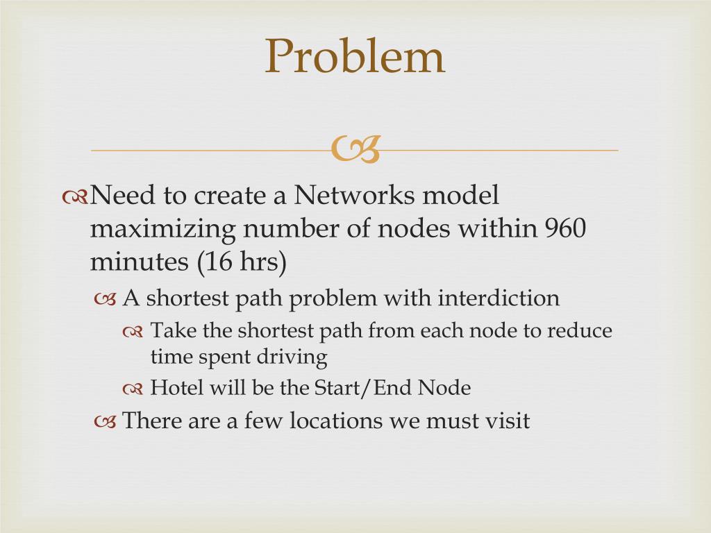 Problem • Need to create a Networks model maximizing number of nodes within 960 minutes (16 hrs) • A shortest path problem with interdiction • Take the shortest path from each node to reduce time spent driving • Hotel will be the Start/End Node • There are a few locations we must visit