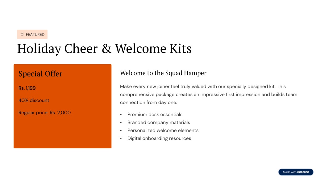 FEATURED Holiday Cheer & Welcome Kits Special Offer Welcome to the Squad Hamper Make every new joiner feel truly valued with our specially designed kit. This comprehensive package creates an impressive first impression and builds team connection from day one. Rs. 1,199 40% discount Regular price: Rs. 2,000 • Premium desk essentials • Branded company materials • Personalized welcome elements • Digital onboarding resources