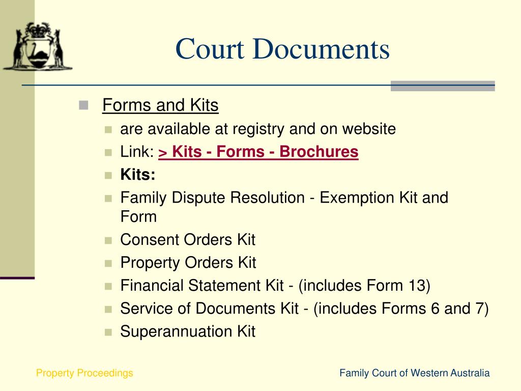 Court Documents • Forms and Kits • are available at registry and on website • Link: > Kits - Forms - Brochures • Kits: • Family Dispute Resolution - Exemption Kit and Form • Consent Orders Kit • Property Orders Kit • Financial Statement Kit - (includes Form 13) • Service of Documents Kit - (includes Forms 6 and 7) • Superannuation Kit Family Court of Western Australia