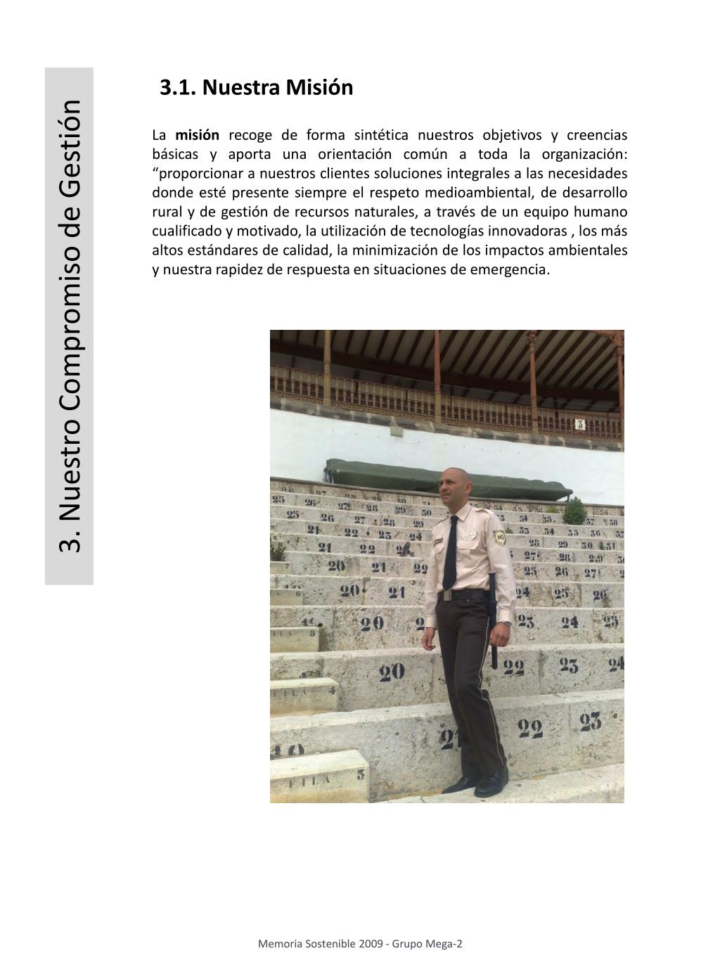 3.1. Nuestra Misión La misión recoge de forma sintética nuestros objetivos y creencias básicas y aporta una orientación común a toda la organización: “proporcionar a nuestros clientes soluciones integrales a las necesidades donde esté presente siempre el respeto medioambiental, de desarrollo rural y de gestión de recursos naturales, a través de un equipo humano cualificado y motivado, la utilización de tecnologías innovadoras , los más altos estándares de calidad, la minimización de los impactos ambientales y nuestra rapidez de respuesta en situaciones de emergencia. 3. Nuestro Compromiso de Gestión Memoria Sostenible 2009 - Grupo Mega-2