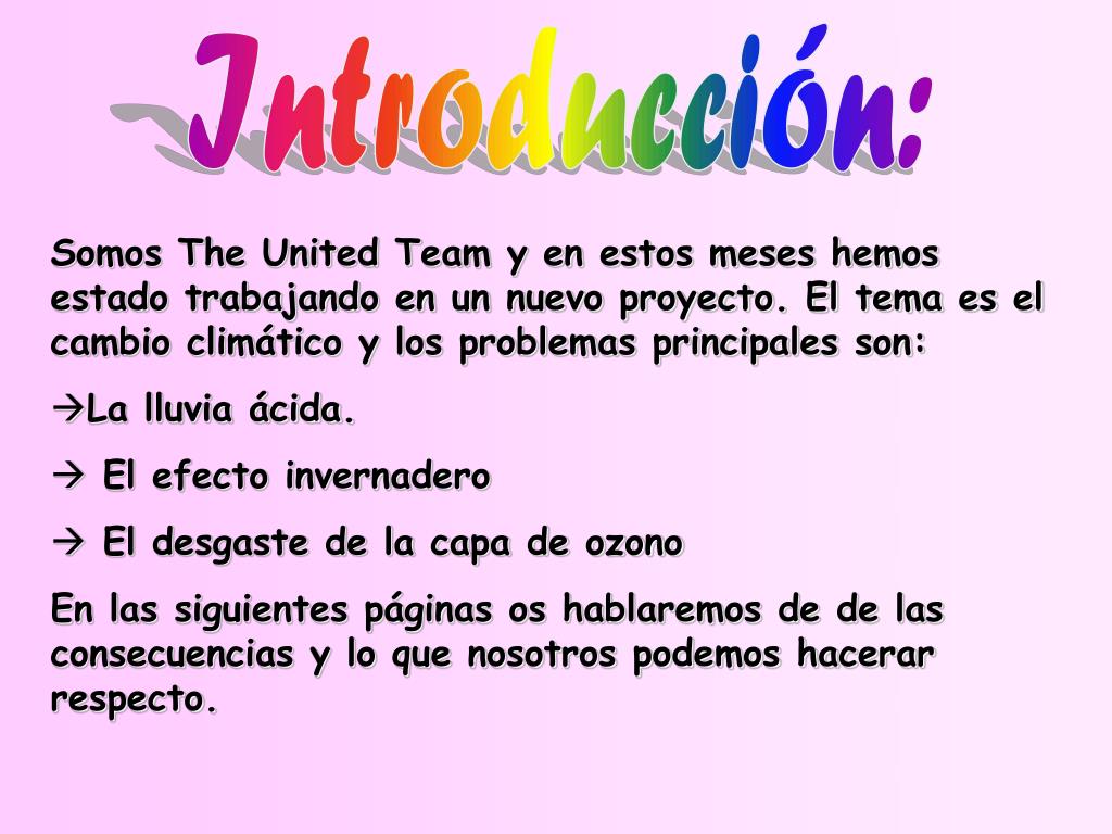Introducción: • Somos The United Team y en estos meses hemos estado trabajando en un nuevo proyecto. El tema es el cambio climático y los problemas principales son: • La lluvia ácida. • El efecto invernadero • El desgaste de la capa de ozono En las siguientes páginas os hablaremos de de las consecuencias y lo que nosotros podemos hacerar respecto.
