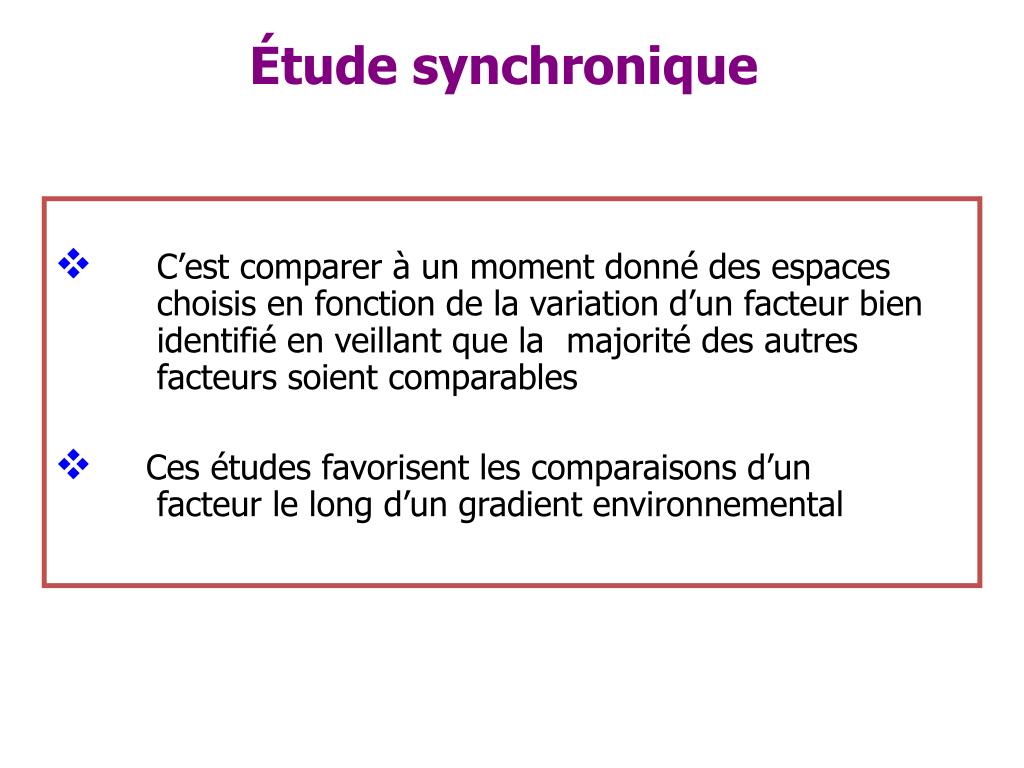 Étude synchronique • C’est comparer à un moment donné des espaces choisis en fonction de la variation d’un facteur bien identifié en veillant que la majorité des autres facteurs soient comparables • Ces études favorisent les comparaisons d’un facteur le long d’un gradient environnemental