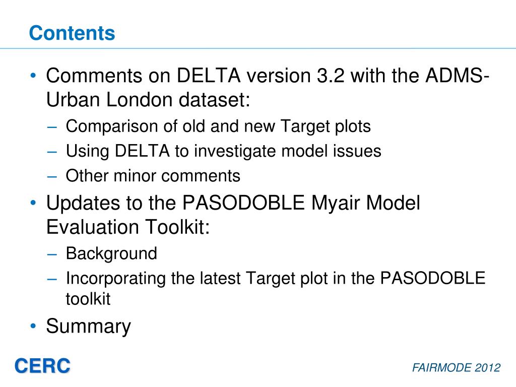 Contents • Comments on DELTA version 3.2 with the ADMS-Urban London dataset: • Comparison of old and new Target plots • Using DELTA to investigate model issues • Other minor comments • Updates to the PASODOBLE Myair Model Evaluation Toolkit: • Background • Incorporating the latest Target plot in the PASODOBLE toolkit • Summary