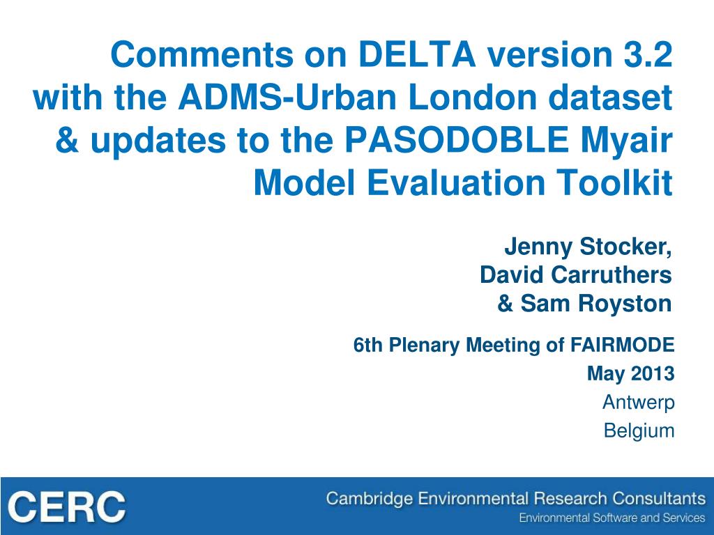 Comments on DELTA version 3.2 with the ADMS-Urban London dataset & updates to the PASODOBLE Myair Model Evaluation Toolkit Jenny Stocker, David Carruthers & Sam Royston 6th Plenary Meeting of FAIRMODE May 2013 Antwerp Belgium