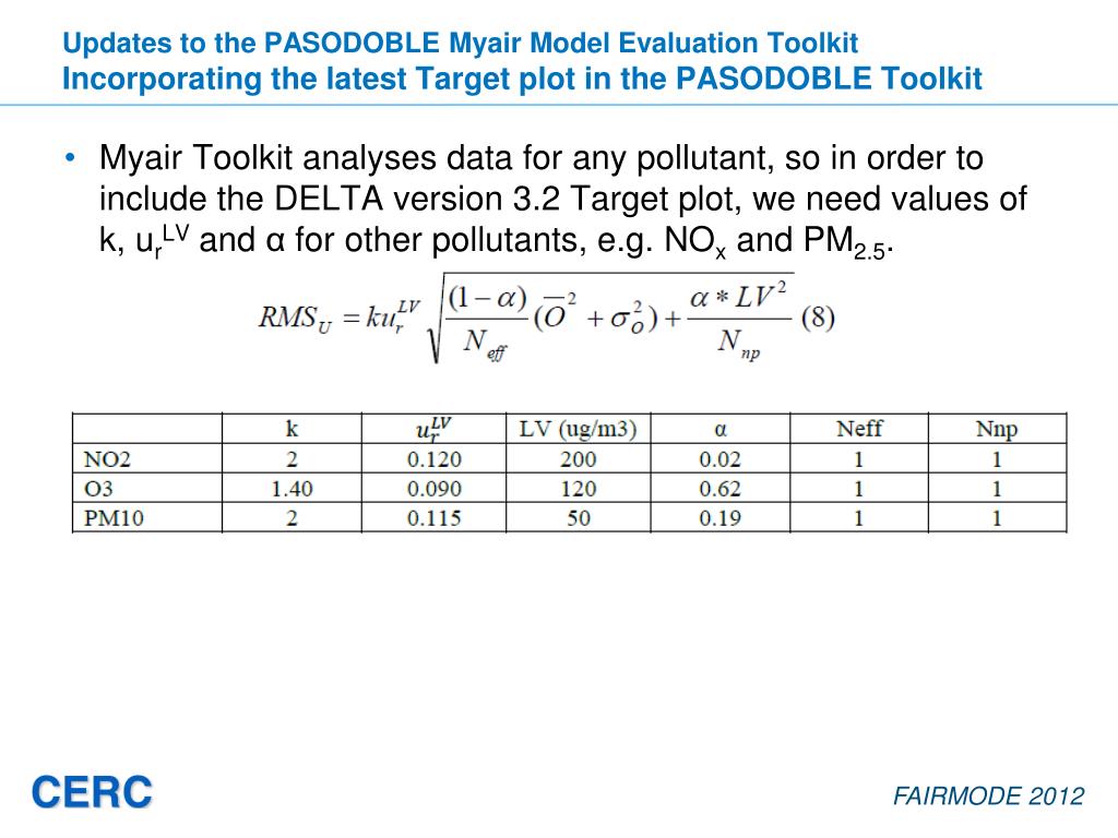 Updates to the PASODOBLE Myair Model Evaluation ToolkitIncorporating the latest Target plot in the PASODOBLE Toolkit • MyairToolkit analyses data for any pollutant, so in order to include the DELTA version 3.2 Target plot, we need values of k, urLV and α for other pollutants, e.g. NOx and PM2.5.