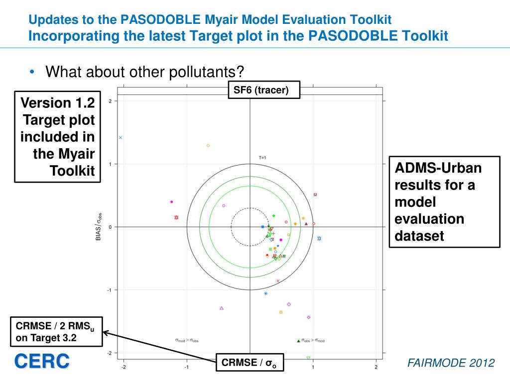 Updates to the PASODOBLE Myair Model Evaluation ToolkitIncorporating the latest Target plot in the PASODOBLE Toolkit • What about other pollutants? SF6 (tracer) Version 1.2 Target plot included in the Myair Toolkit ADMS-Urban results for a model evaluation dataset CRMSE / 2 RMSu on Target 3.2 CRMSE / σo