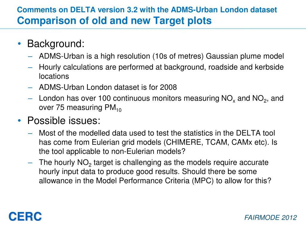Comments on DELTA version 3.2 with the ADMS-Urban London datasetComparison of old and new Target plots • Background: • ADMS-Urban is a high resolution (10s of metres) Gaussian plume model • Hourly calculations are performed at background, roadside and kerbside locations • ADMS-Urban London dataset is for 2008 • London has over 100 continuous monitors measuring NOx and NO2, and over 75 measuring PM10 • Possible issues: • Most of the modelled data used to test the statistics in the DELTA tool has come from Eulerian grid models (CHIMERE, TCAM, CAMx etc). Is the tool applicable to non-Eulerian models? • The hourly NO2 target is challenging as the models require accurate hourly input data to produce good results. Should there be some allowance in the Model Performance Criteria (MPC) to allow for this?