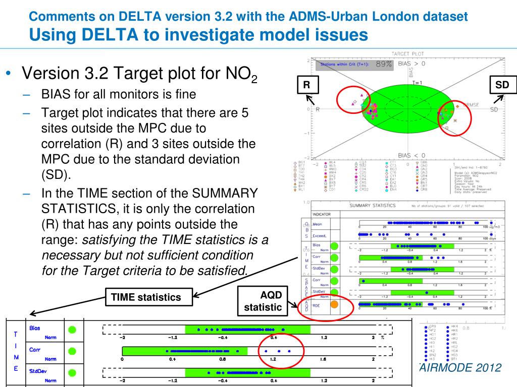 Comments on DELTA version 3.2 with the ADMS-Urban London datasetUsing DELTA to investigate model issues • Version 3.2 Target plot for NO2 • BIAS for all monitors is fine • Target plot indicates that there are 5 sites outside the MPC due to correlation (R) and 3 sites outside the MPC due to the standard deviation (SD). • In the TIME section of the SUMMARY STATISTICS, it is only the correlation (R) that has any points outside the range: satisfying the TIME statistics is a necessary but not sufficient condition for the Target criteria to be satisfied. R SD AQD statistic TIME statistics