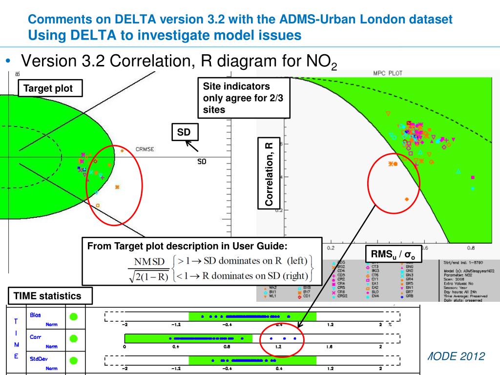 Comments on DELTA version 3.2 with the ADMS-Urban London datasetUsing DELTA to investigate model issues • Version 3.2 Correlation, R diagram for NO2 Site indicators only agree for 2/3 sites Target plot SD Correlation, R RMSu / σo From Target plot description in User Guide: TIME statistics